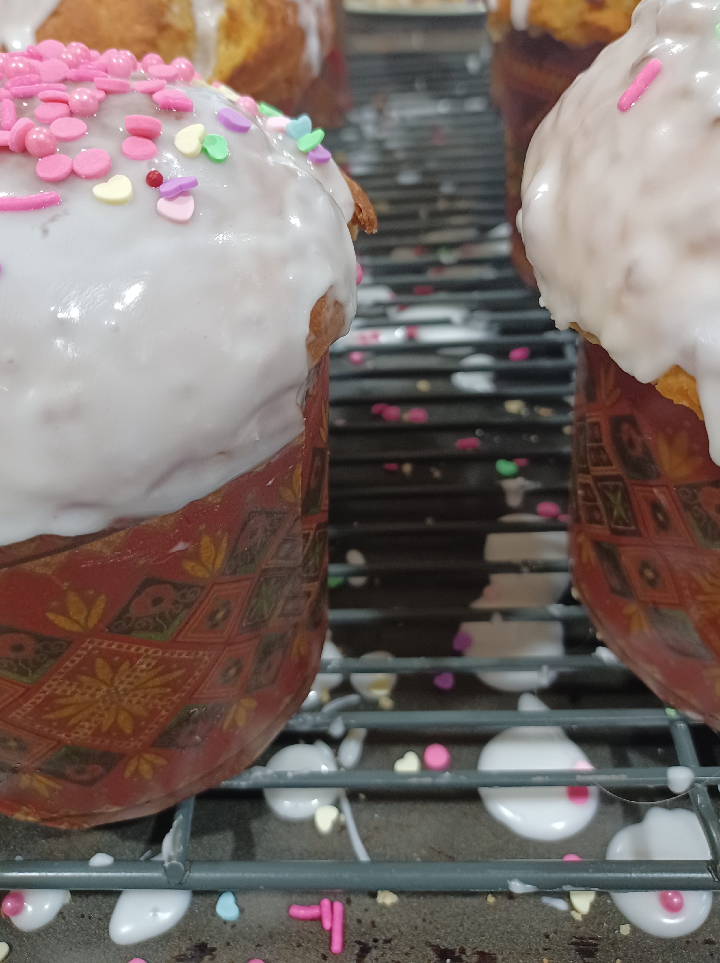 Take about 2 cups powdered sugar into a small bowl. Add some vanilla (about a 1/2 teaspoon) Now add milk or water, 1 Tablespoon at a time till you get the consistency you want. Now spoon some over each Paska, then sprinkle them.