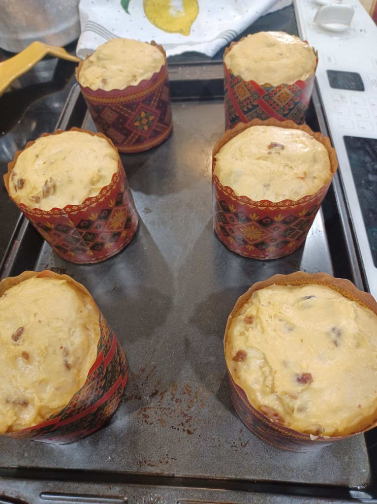 Now divide your dough into 7 portions and place it into your 7 paper molds , only fill half way up. ( When you divide your dough into 7 pieces, you will have the right amount for each paper baking pot.)