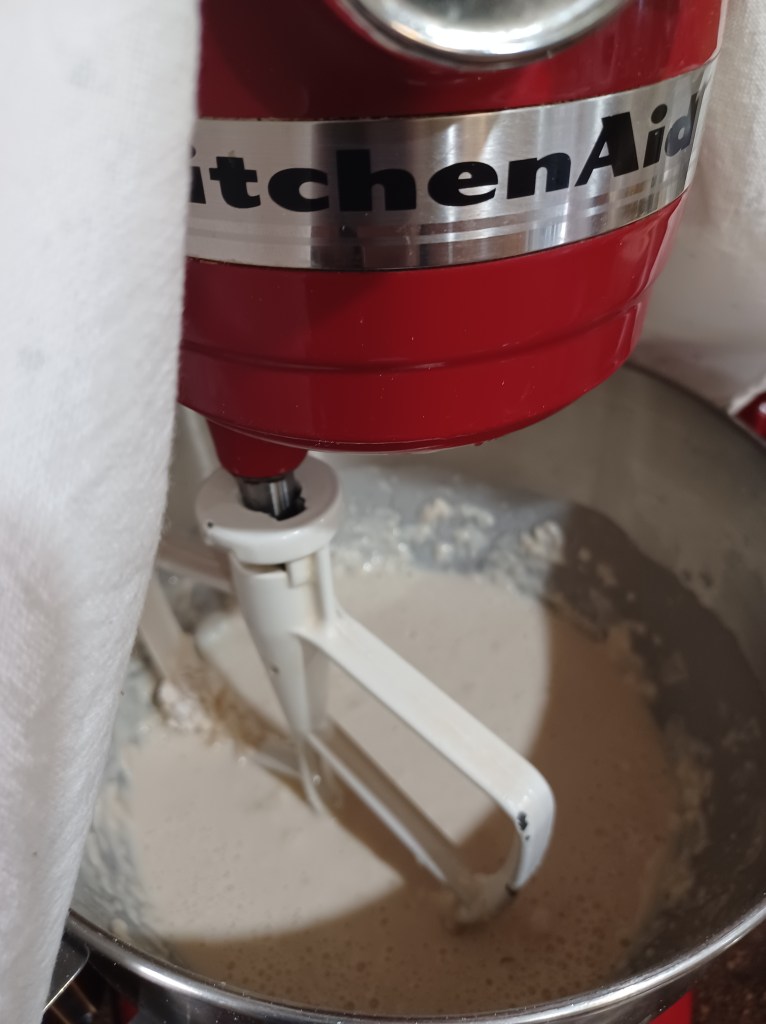 Place the warm milk, yeast and 2 cups of flour in your mixer bowl. Combine well, then cover with a kitchen towel and let it sit for 30 minutes.
