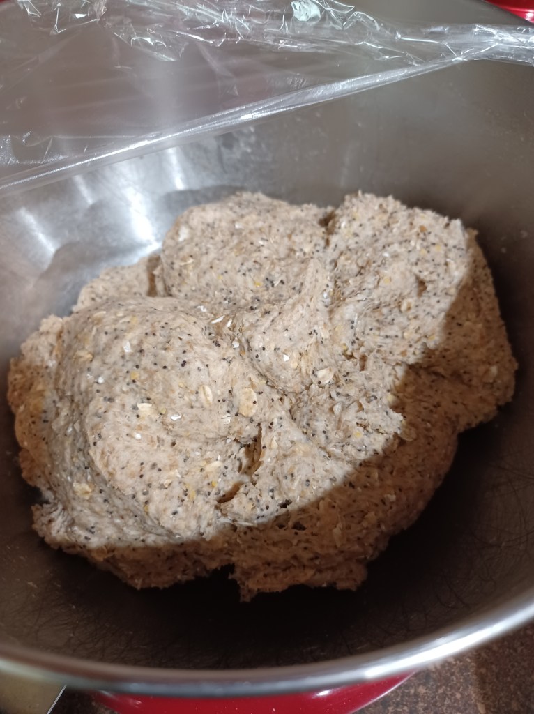 Now add the flours and salt to the mixture and stir with the mixer dough hook till it forms a ball, now cover with plastic and let it rest for 20 minutes.