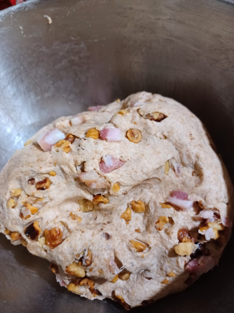 This is a great bread to make when you are serving a hearty stew, a delicious pasta dish or any other dish when you want a bread that has “stuff” in it! It is full of pancetta and toasted walnuts, it tastes really good toasted as well. It would go with eggs for breakfast, maybe even chipped beef with toast. I love this bread and I hope you will try it!