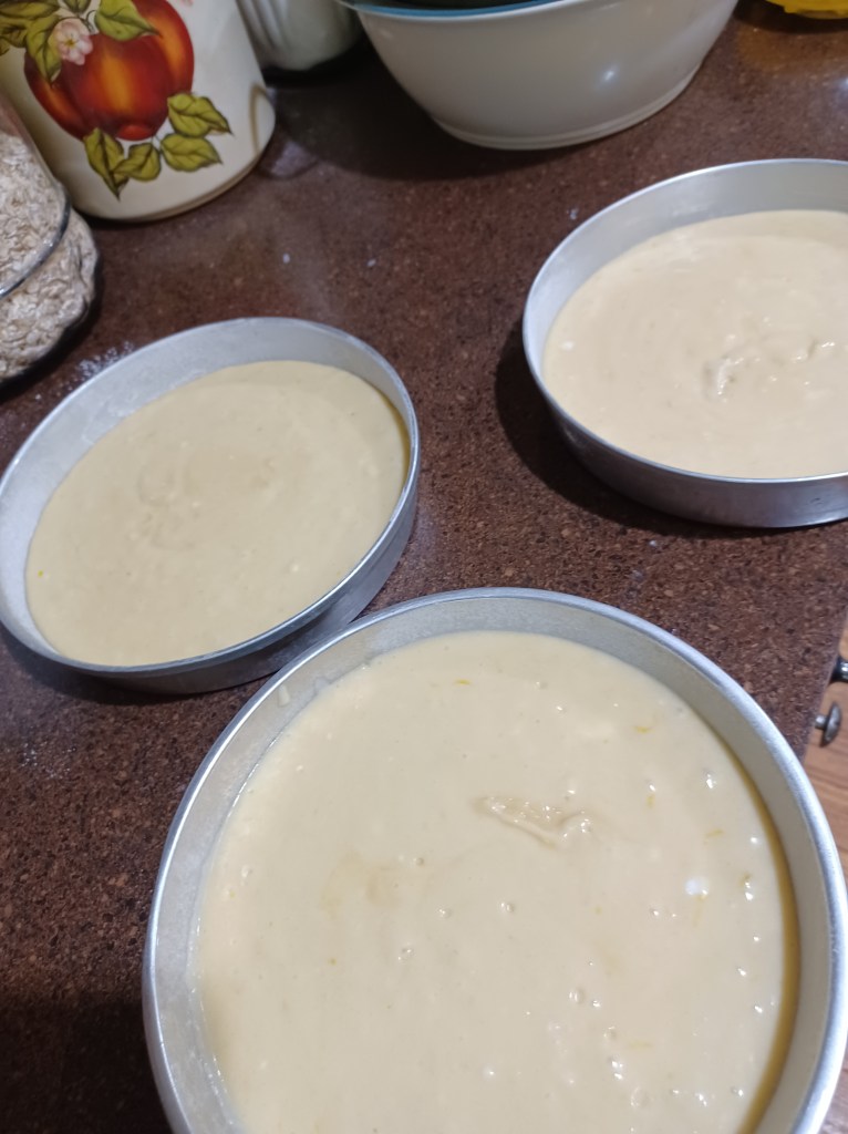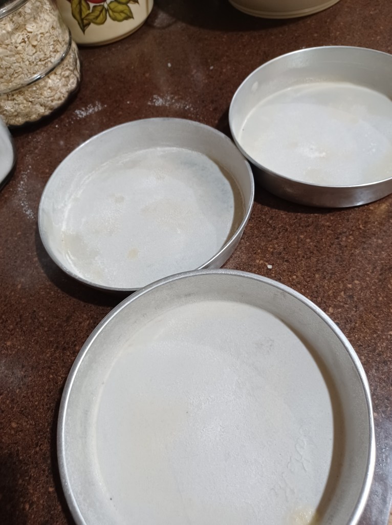 Now prepare 3 8-inch pans (or 2 9-inch pans)