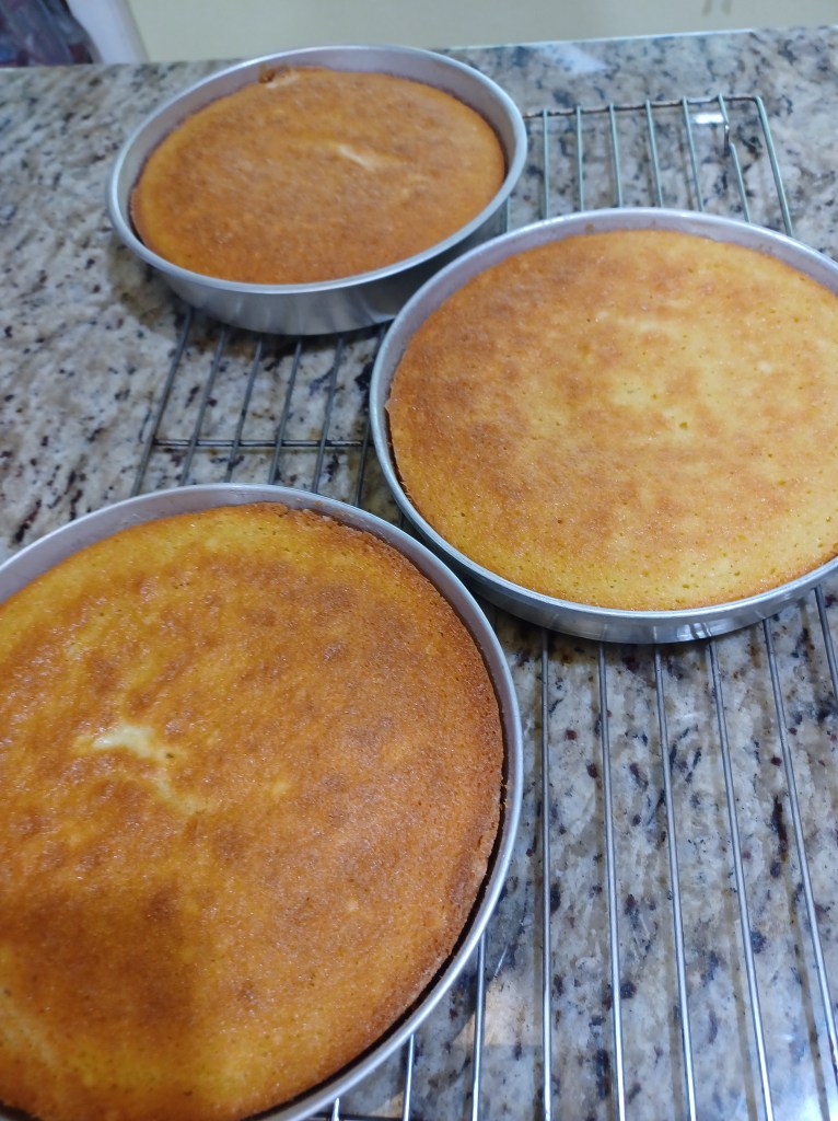 Take the cakes out of the oven and let them cool in their pans on a cooling rack.
