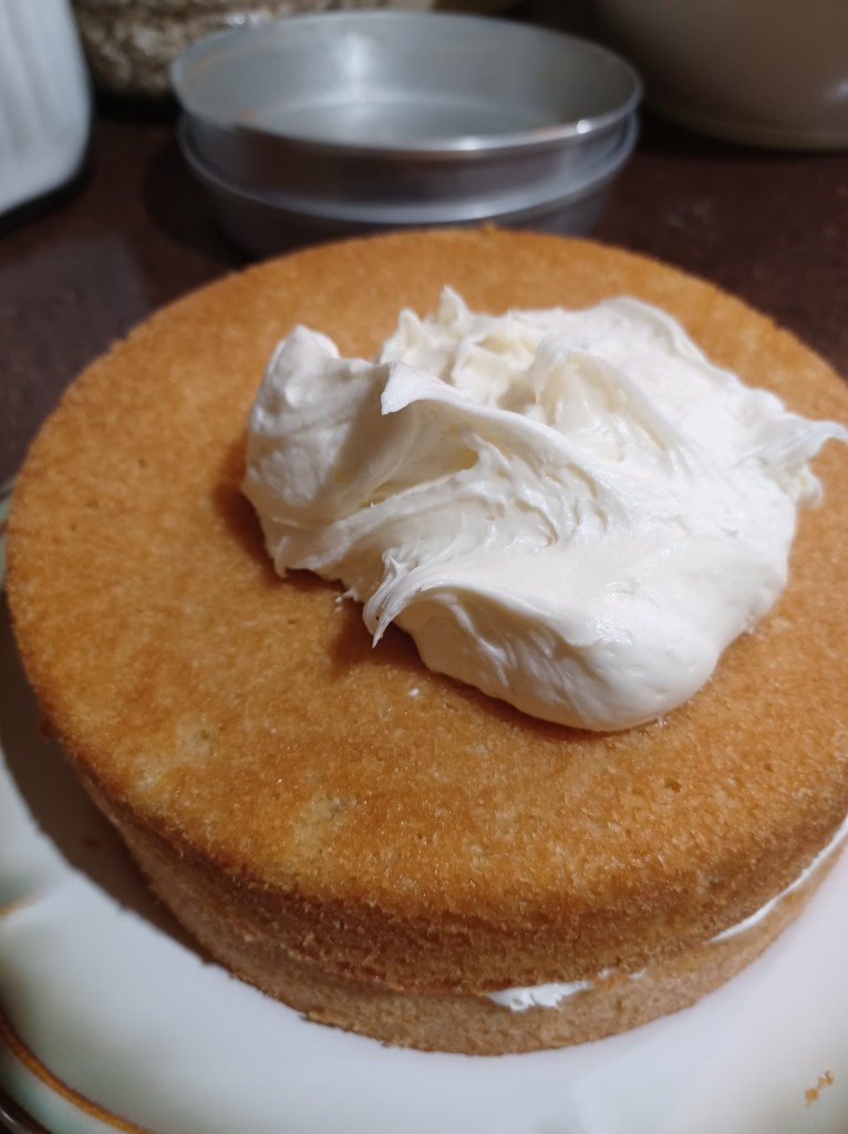 Add some frosting to the center of the cake layer, smooth out, now add another layer and repeat the process till you have all layers stacked.