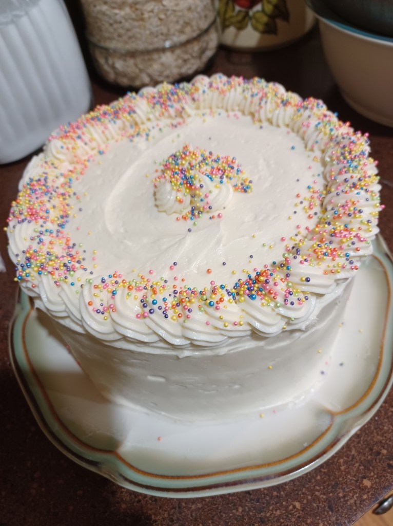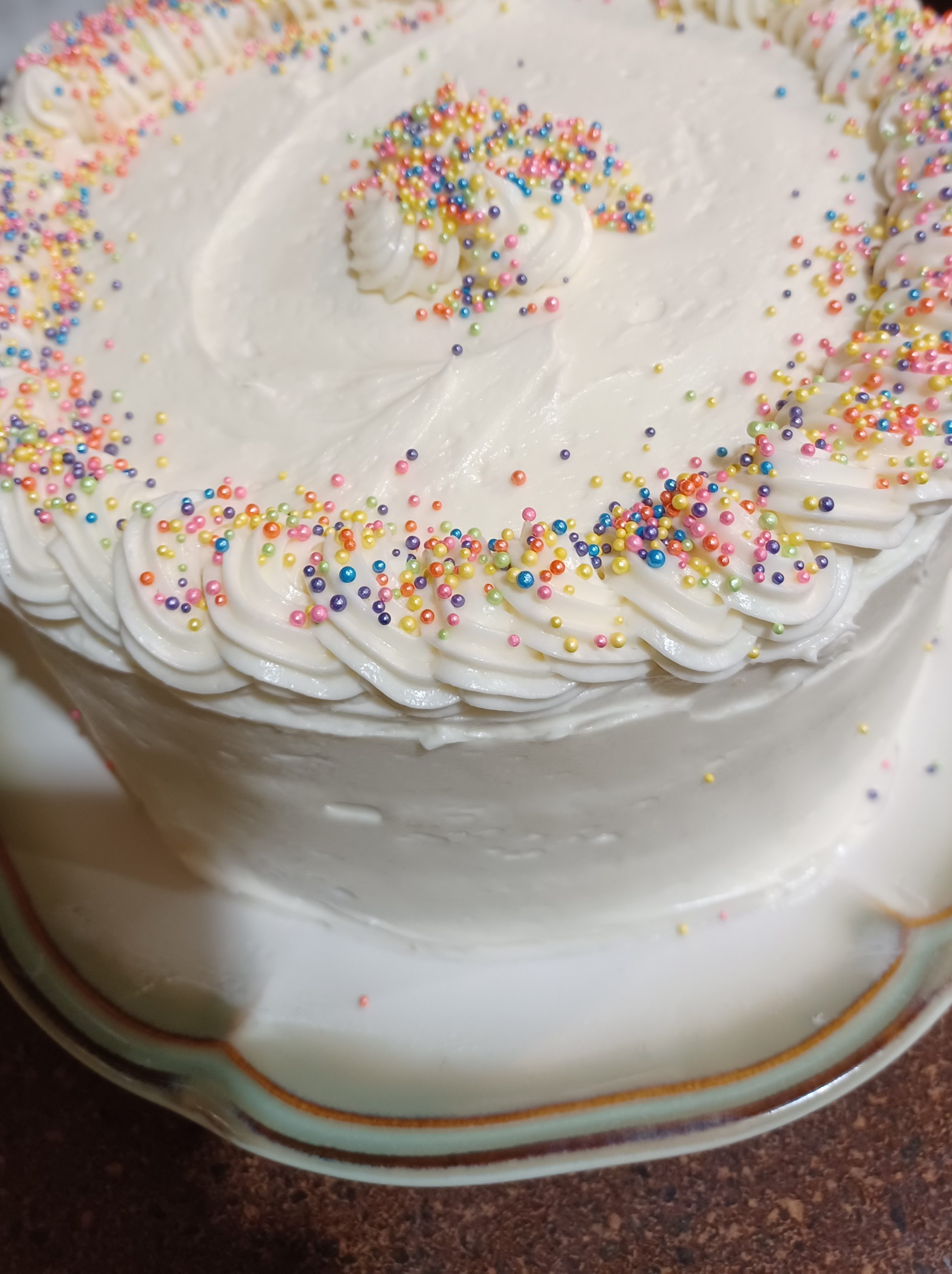 Now fill a piping bag and pipe a decorative border. Now you can sprinkles to decorate if desired.