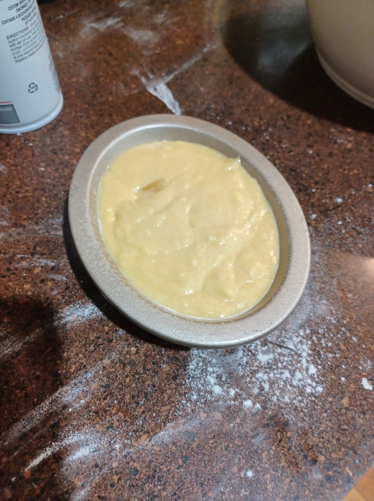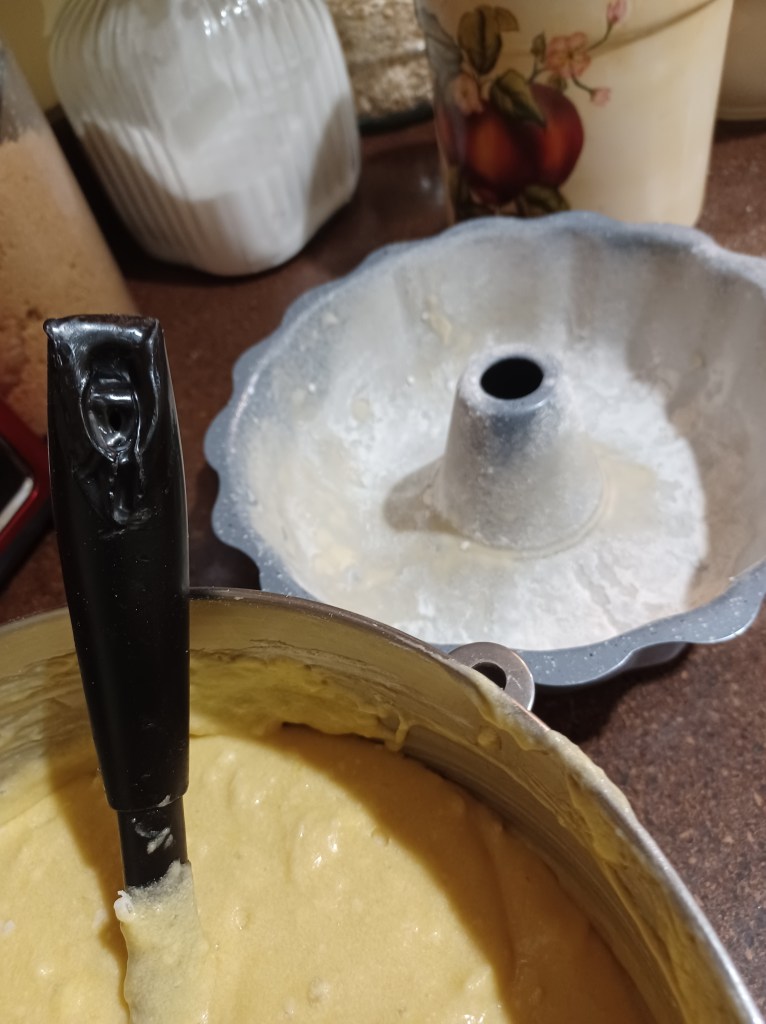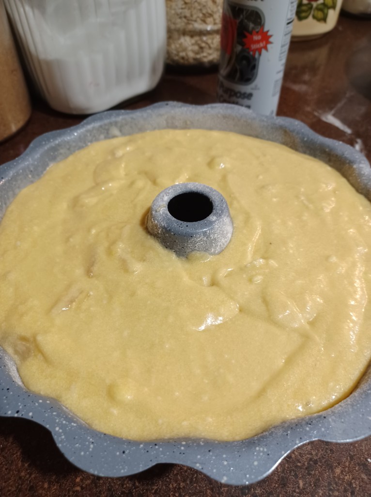 Now put the batter into pan. (This makes a huge cake, I put one small cake pan so I could not overfill my bundt pan)