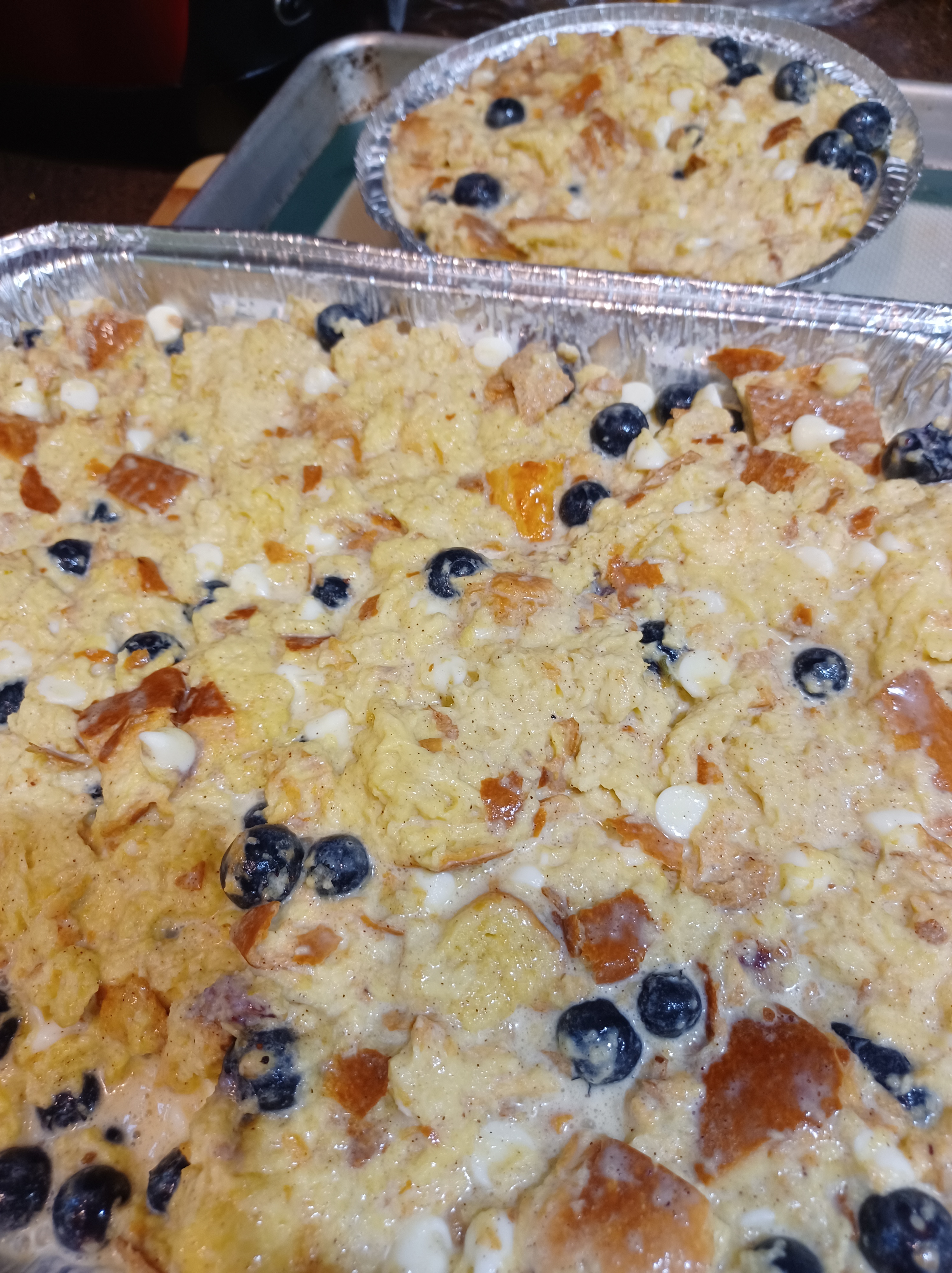 Now pour the mixture over the challah bread cubes. Now add the blueberries and white chocolate. Stir gently.