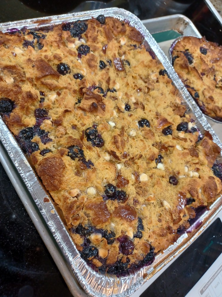 I used to make this bread pudding at the restaurant where I was a chef. It was a customer and employee favorite! It is a very rich and delicious dessert. Full of blueberries and white chocolate, how can you go wrong?