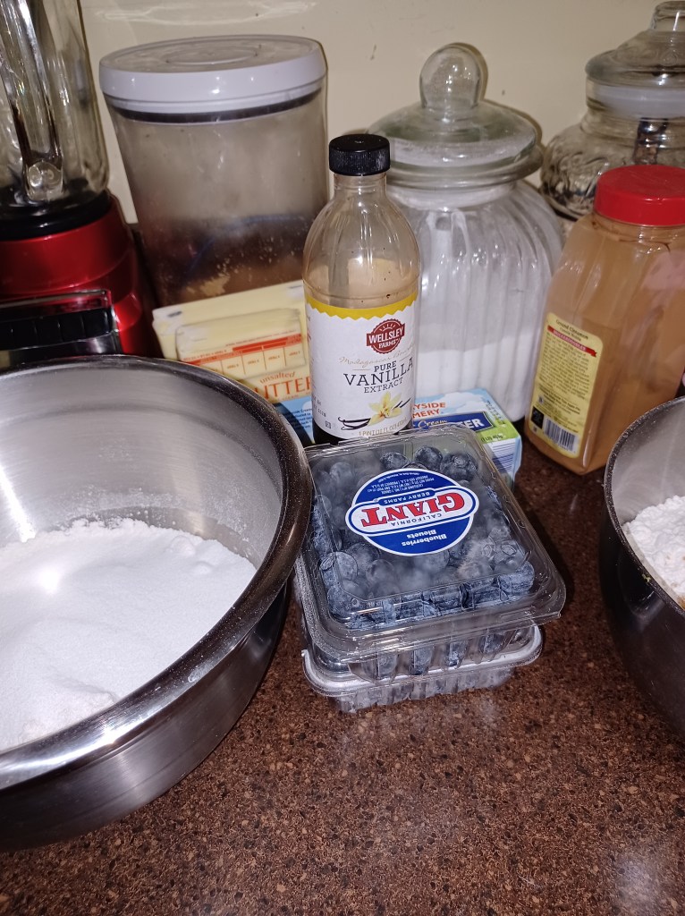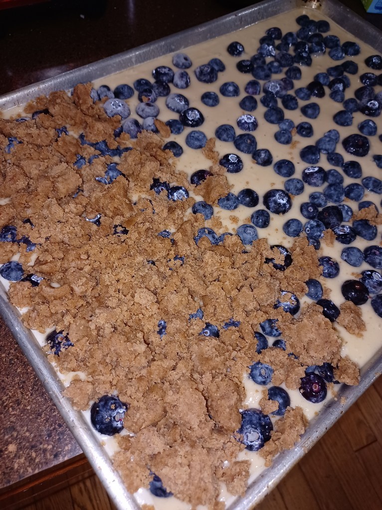 Now pour the batter into the sheet pan, it will be a relatively thin layer. Now cover the batter with 2 pints of blueberries.