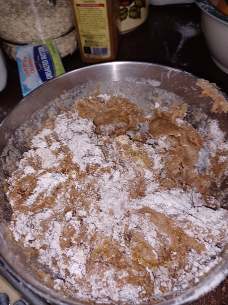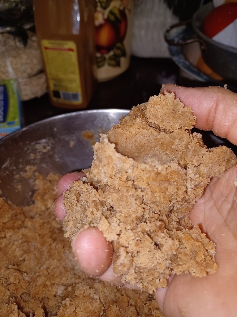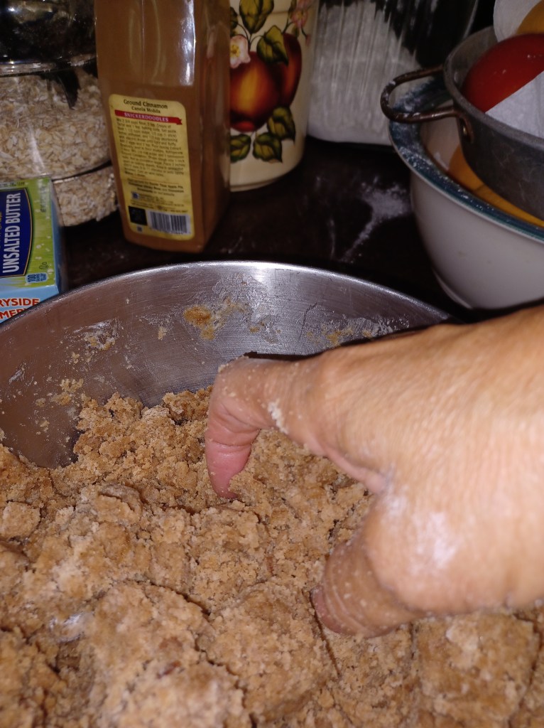 Now blend the crumb topping with a whisk, now add the melted butter and blend well with a wooden spoon then finish with your hands. It is very important to mix the crumb topping after the cake is in the pan because when you do it first and have it sitting there, it gets weird…trust me…LOL