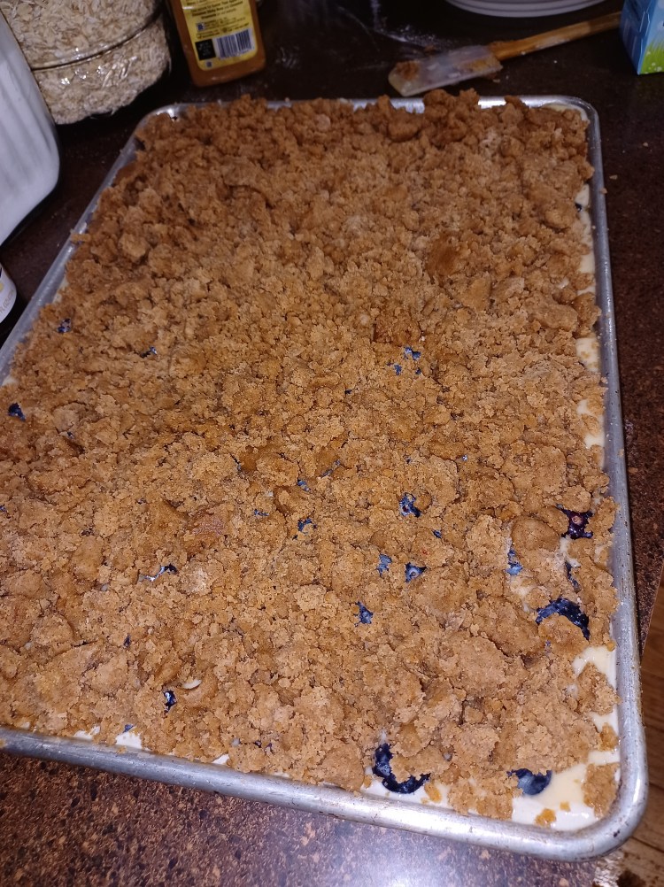 As soon as you mix the crumb topping, crumble it over your cake batter as shown.