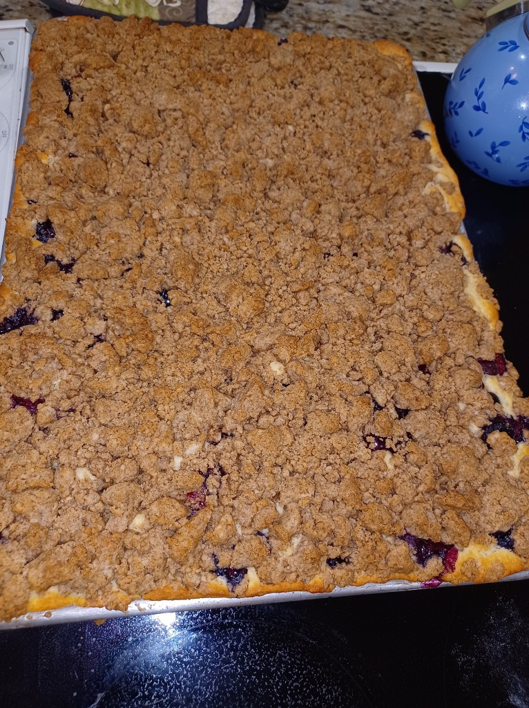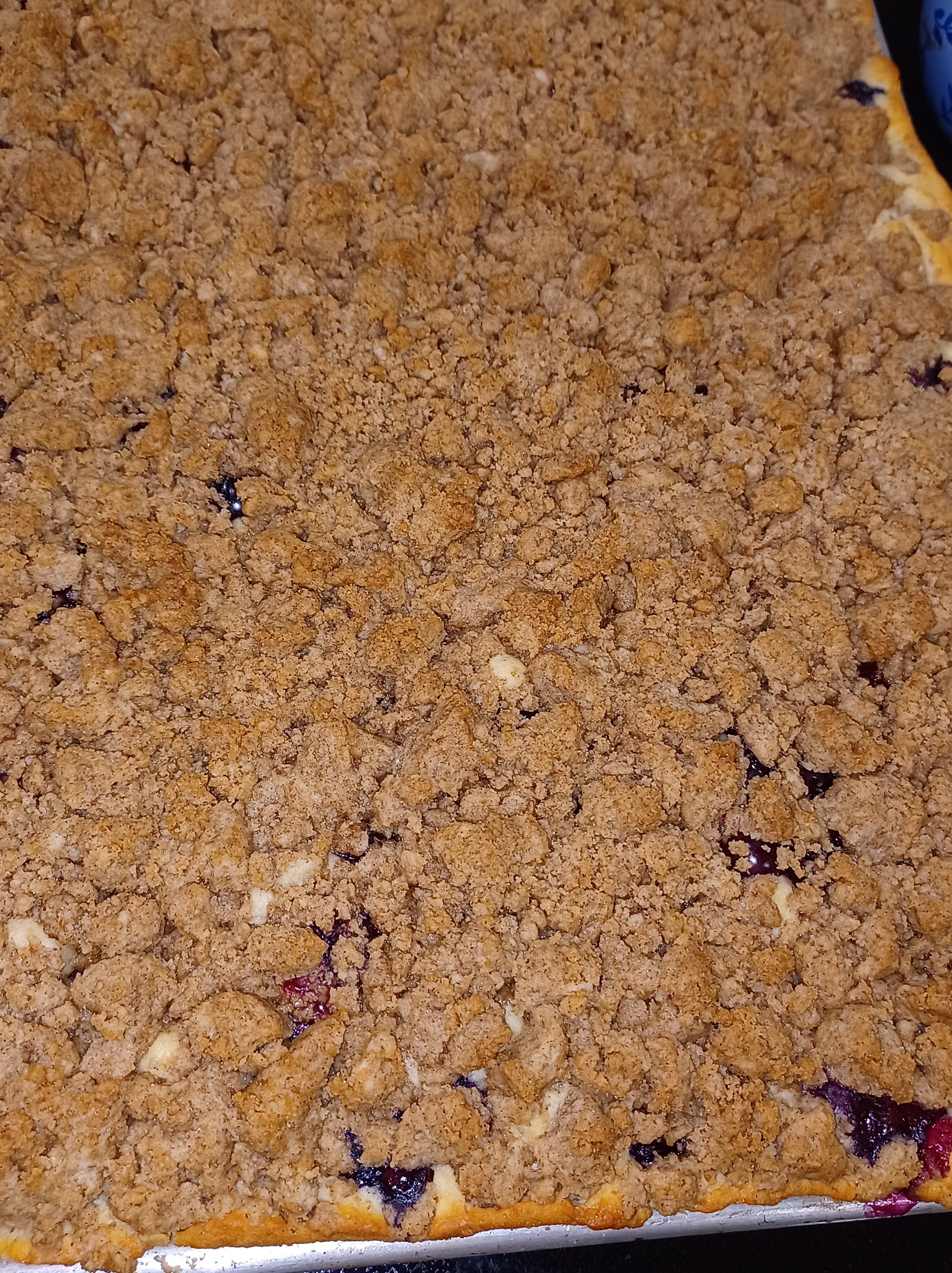 This is blueberry crumbcake. It was one of my most popular breakfast treats at the market. People would buy 6 or 8 pieces at a time! It is super delicious and loaded with blueberries! The vanilla base cake covered with blueberries then topped with a rich, buttery crumb. It is hard to beat this crumbcake!