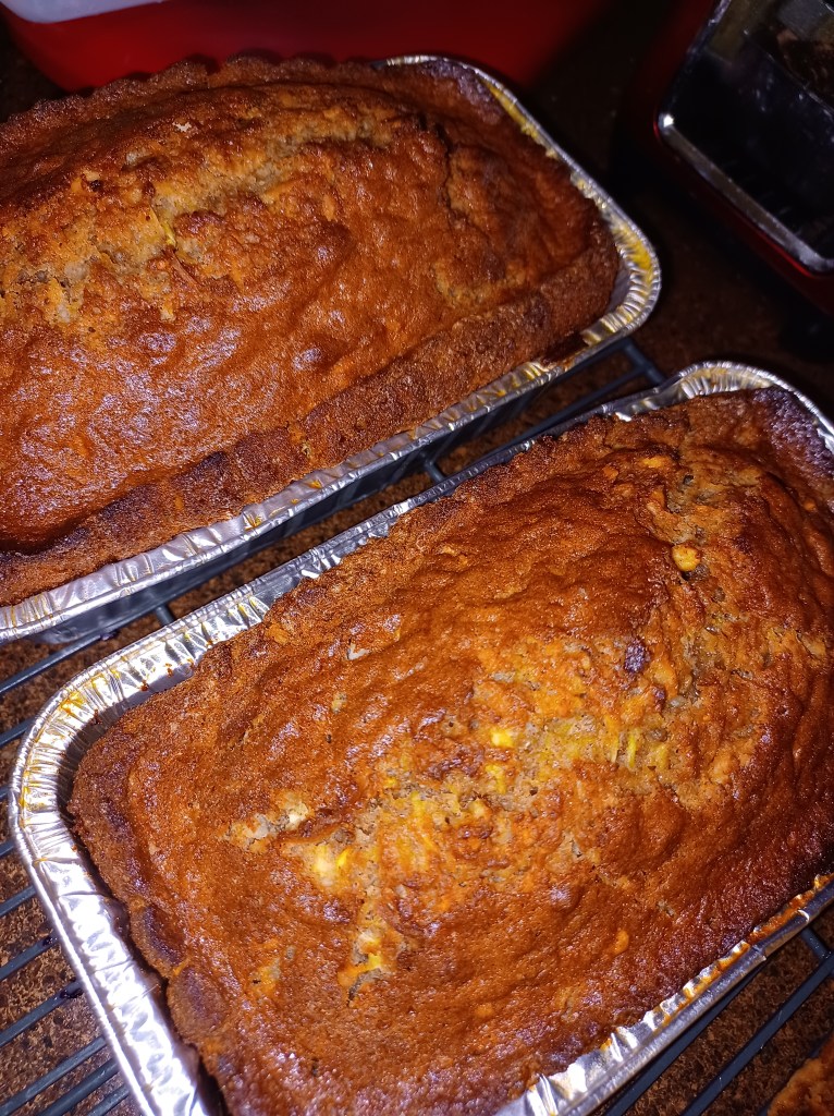 It’s zucchini time!! We all have a plethora of zucchini this time of year, from our gardens or friends! This is a great zucchini bread, chock full of pineapple and walnuts.