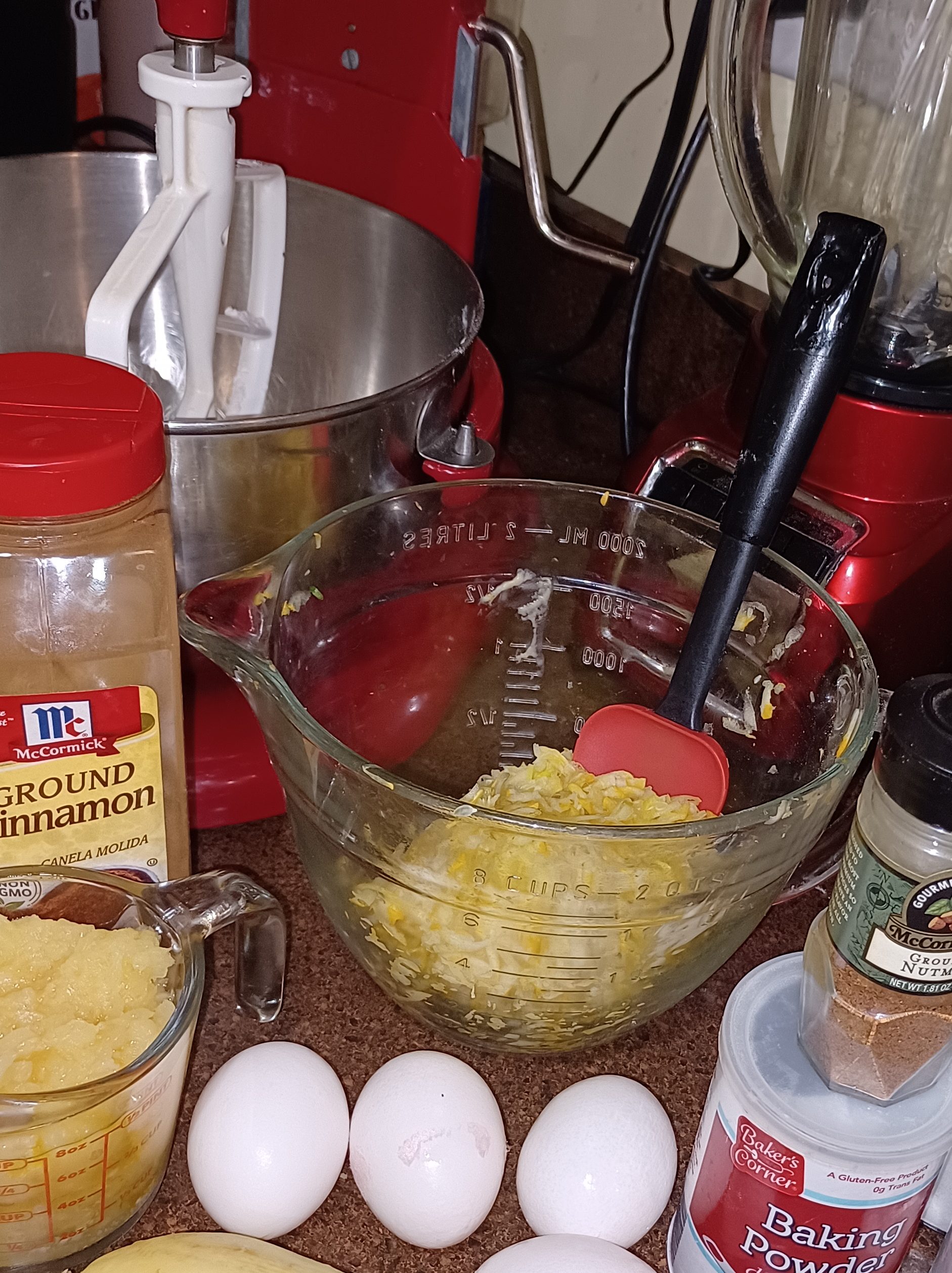 Flour, baking soda, baking powder, salt, sugar, oil, 4 eggs, 2 teaspoons vanilla, cinnamon, nutmeg, then zucchini and pineapple.