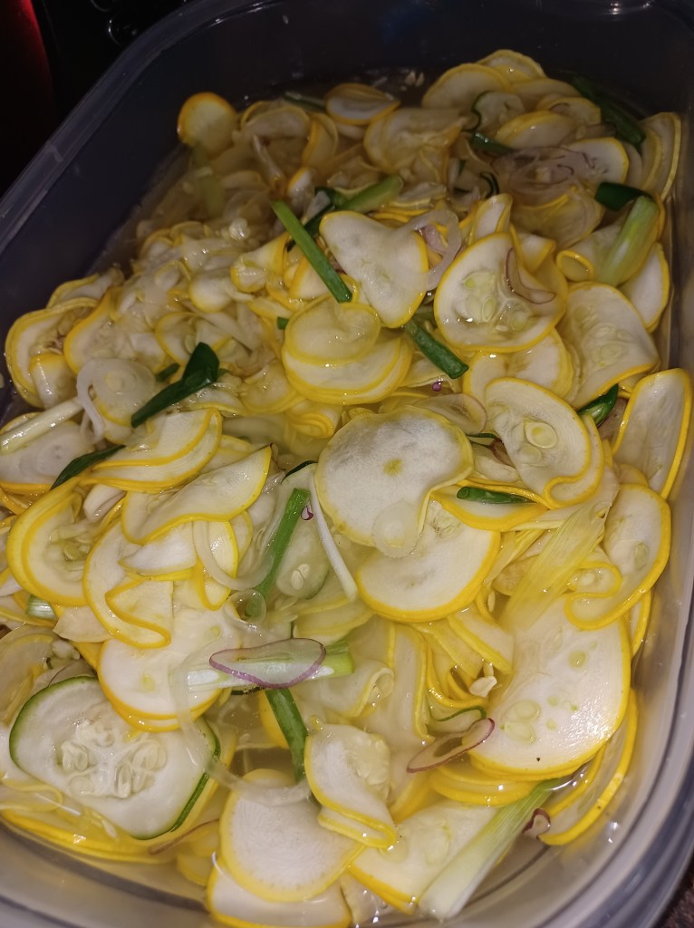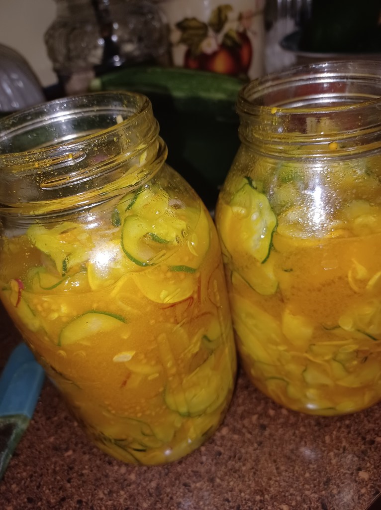 Now put the squash mixture into your jars, then pour the warm brine over the squash mixture. Place lids on the jars and let sit on the counter till cool, Now place in the fridge for at least 24 hours to blend and pickle.