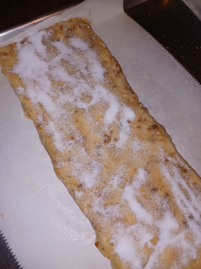Now form the dough into a large log. Flatten the log and brush with water then sprinkle with sugar and sliced almonds