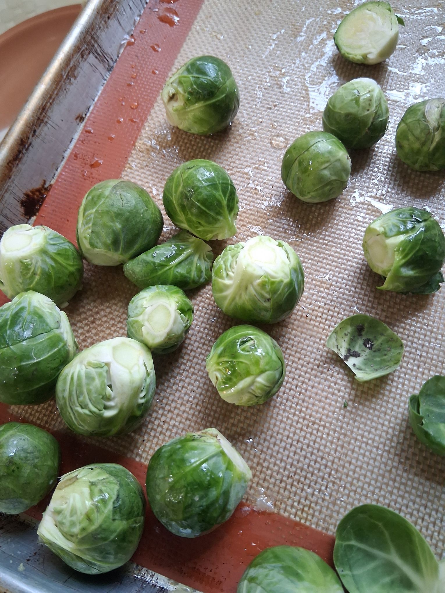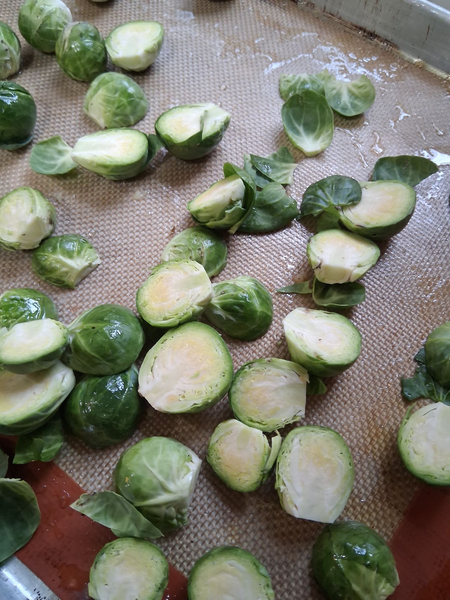 Wash your sprouts, then cut off the stem end. Now slice them in half. Place on a baking sheet with parchment or a sil pat.