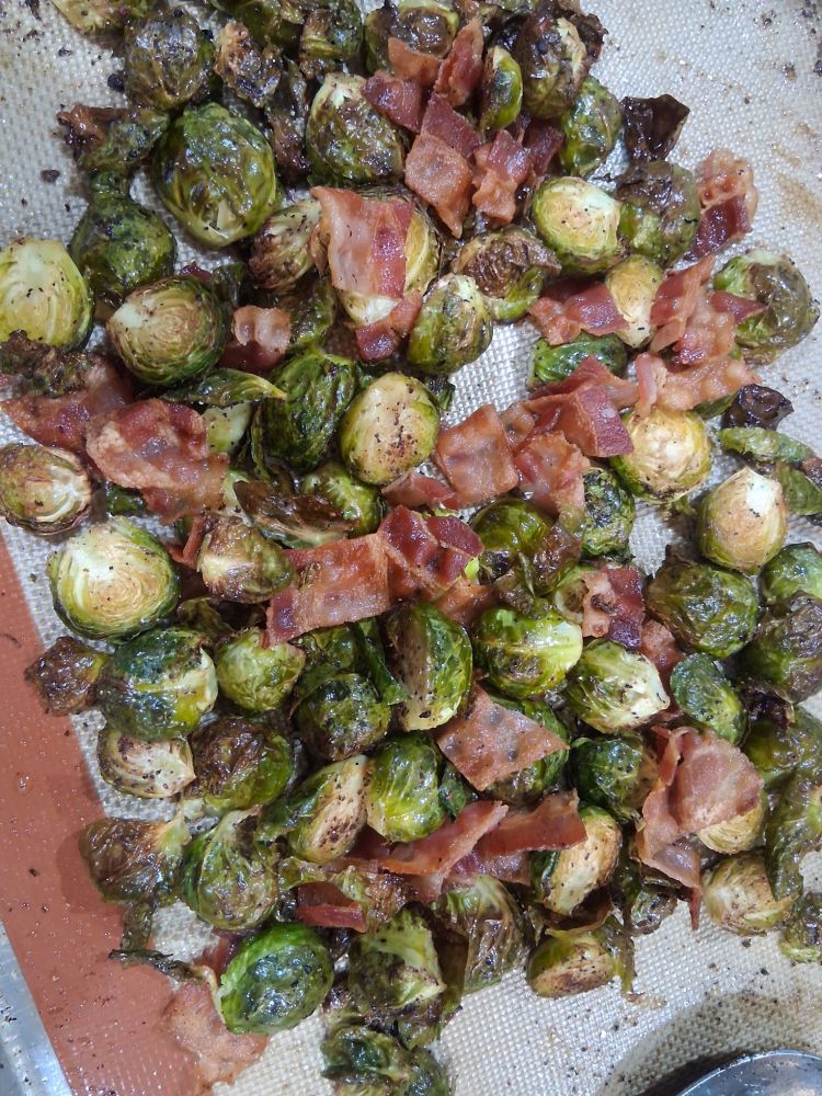 In the last 10 minutes, stir your precooked bacon into your sprouts.