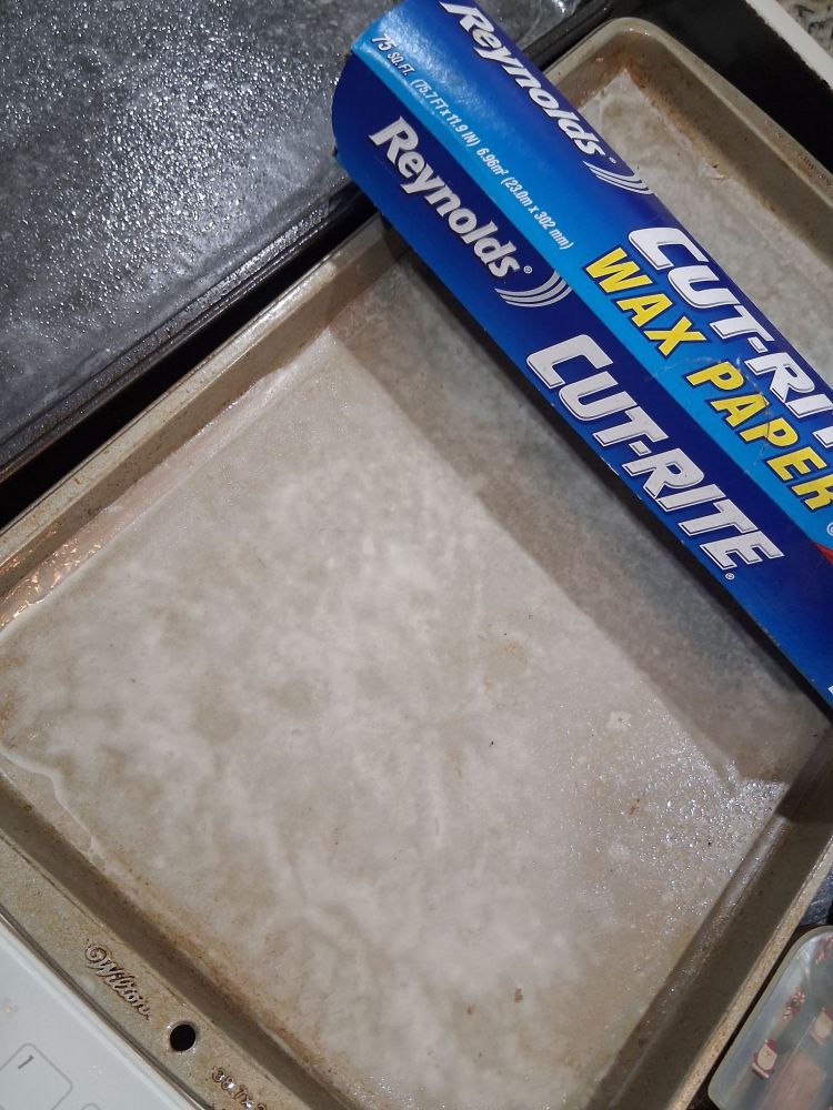 Cut waxed paper(not parchment paper) then spray the pan with pan spray, now place the waxed paper in the cake roll pan.