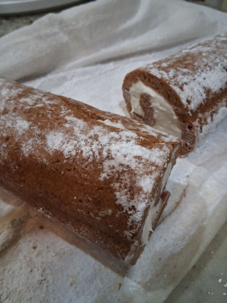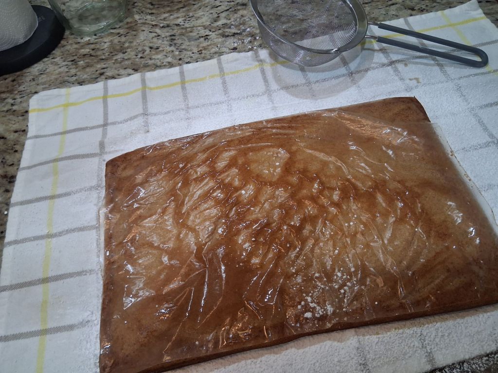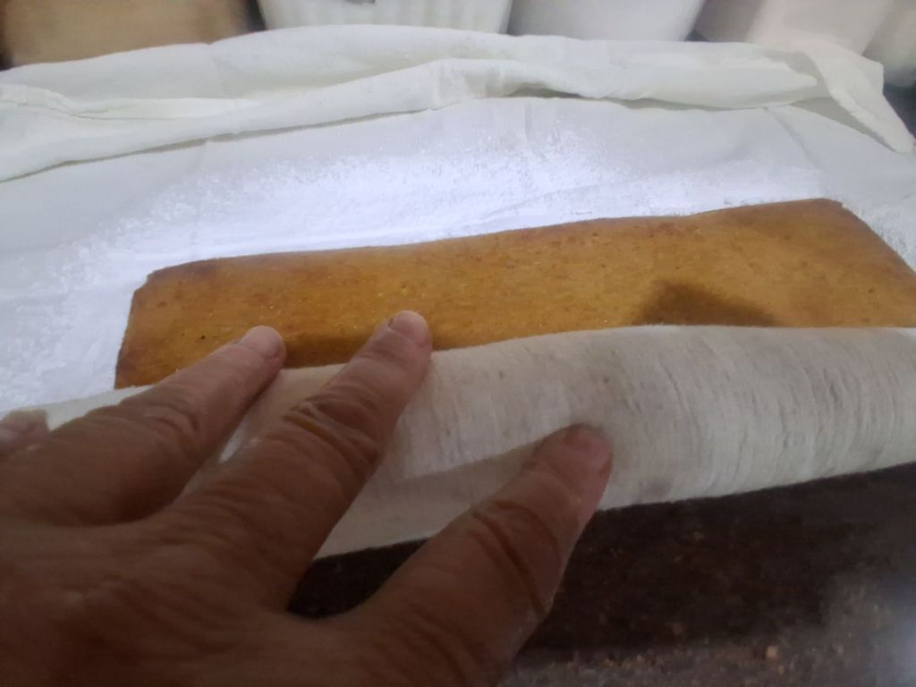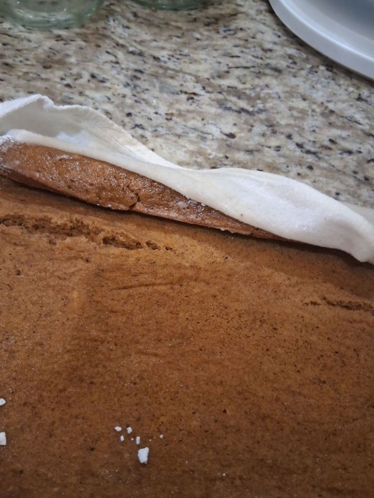 When the cake comes out of the oven immediately turn it out onto the powdered cover towel, then pull off the wax paper very carefully now roll up the cake in the towel