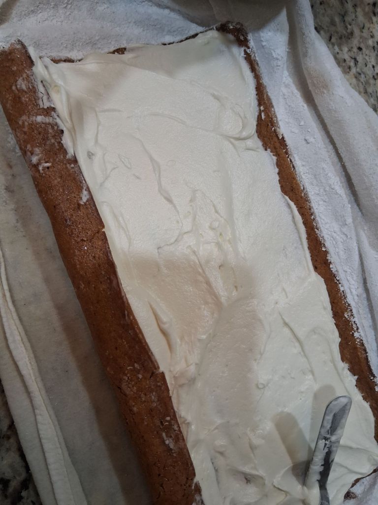 Now spread your filling carefully onto the cake, making sure to get filling in the crease where it is folded over. Just gently lift up the cake and stuff filling in it