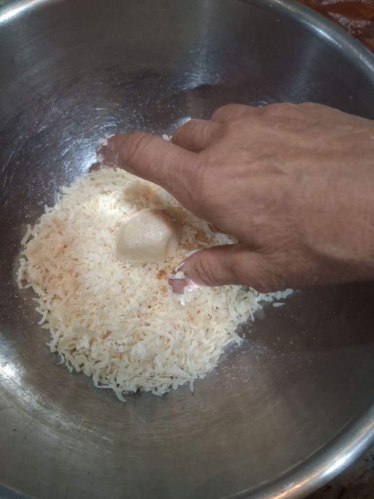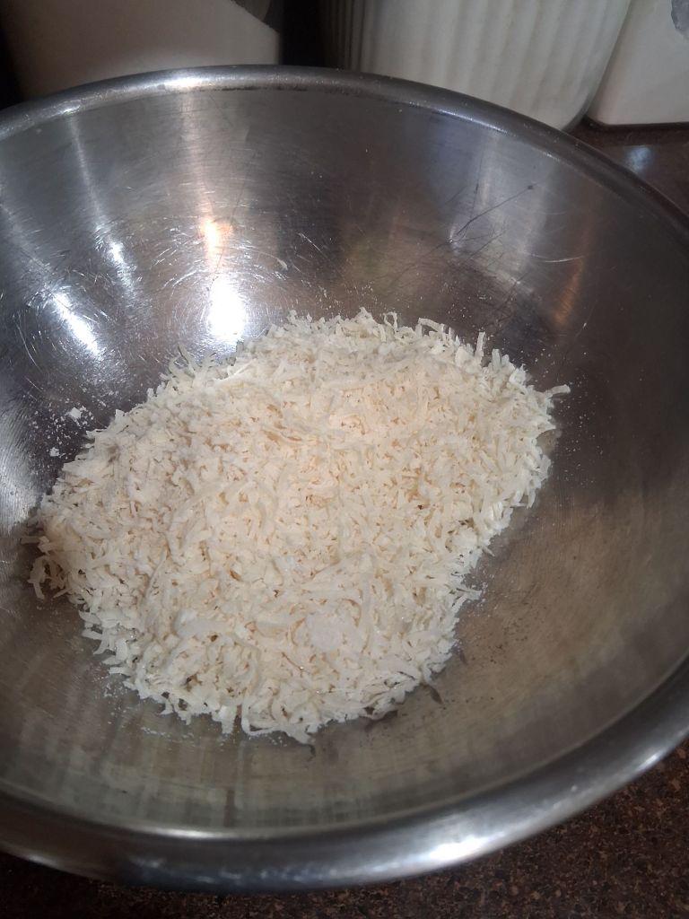 Make an egg white bowl and a bowl full of coconut