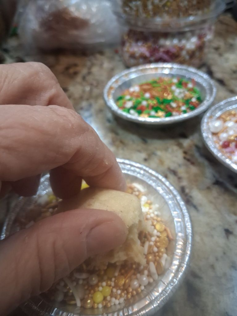 Now place each cookie in your hand then using your fingers, dip each cookie in the sprinkles as shown above.